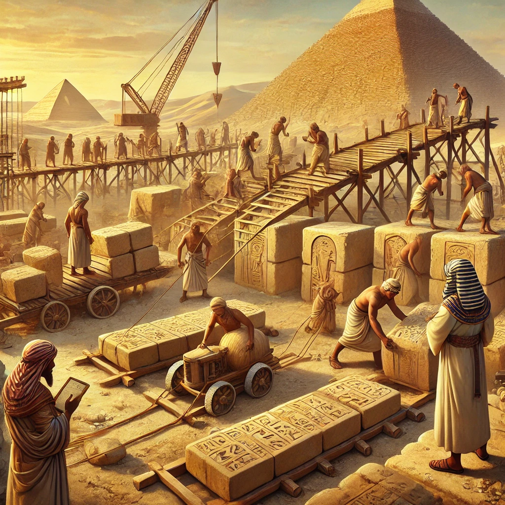 고고학적 증거에 따르면, 피라미드 건설에는 수만 명의 숙련된 노동자가 동원되었으며, 이들은 단순한 노예가 아니라 정부에서 제공한 식량과 거처를 받은 근로자였다. 이들은 거대한 경사로와 도르래를 사용하여 돌을 운반하고, 정밀한 측량 기법을 활용해 피라미드의 정확한 형태를 유지했다.
